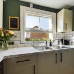 The contemporary bathroom is sleek and practical, fitted with a modern white suite that complements the home's design. Moving on, the separate kitchen at the rear offers a functional yet stylish space, fitted with crisp white units and a tasteful brick-effect splashback.